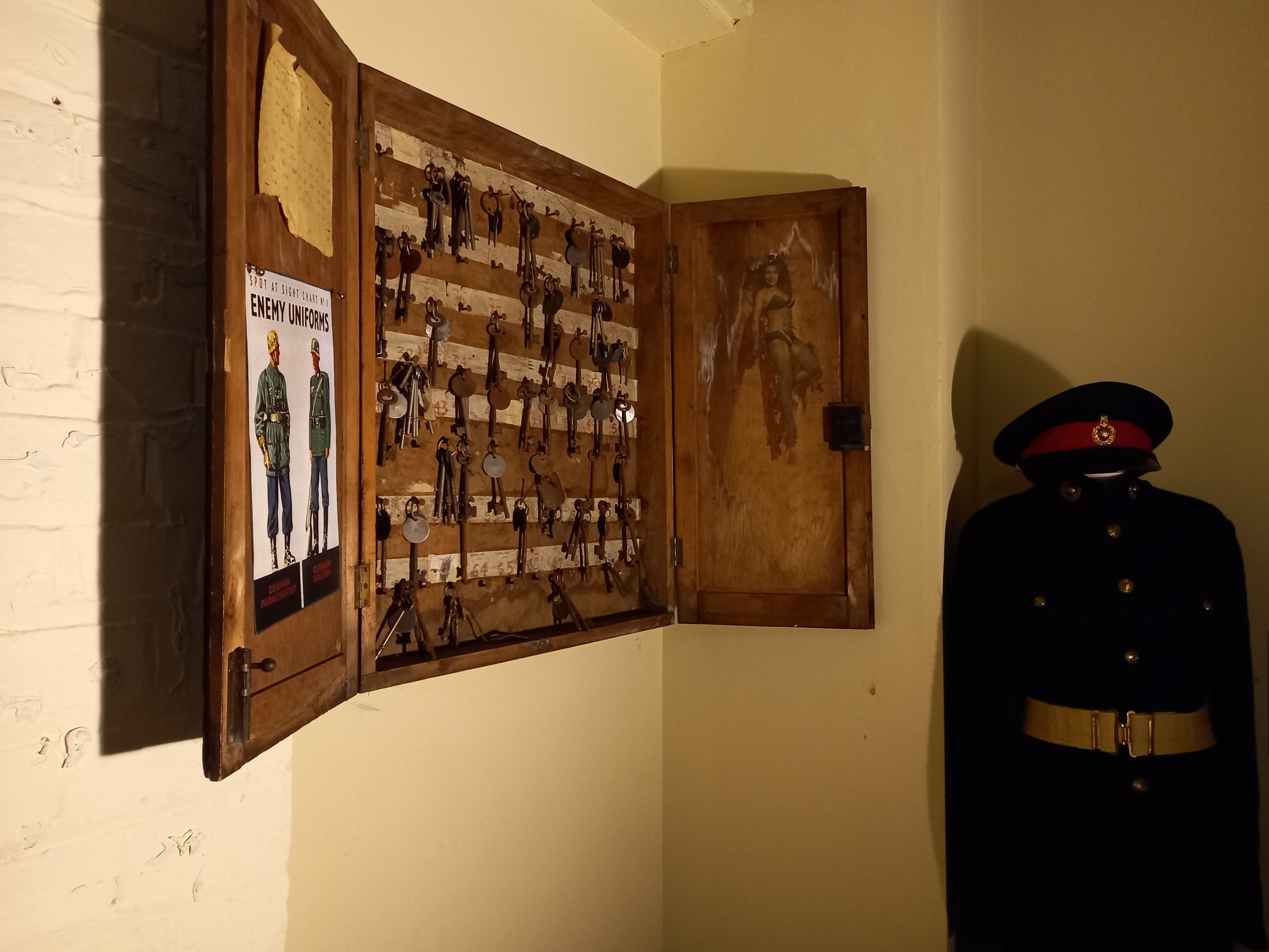 Throughout the museum, interpretative information boards explain what we are seeing, where we are standing, and how the course of the war was affected by the work of the people who once filled this secret space. But sometimes the more personal characters of those people seem to be come, however briefly, into view. A key cupboard is affixed to a wall behind a desk outside one of the main entrances to the heart of the bunker – a metal door next to which permanently armed members of the Royal Marines would have been stationed. An example of a Marines uniform is on display for visitors to see, next to coat hooks where a uniform jacket has been hung, as if by the man on duty. The doors of the cupboard are open, and the original, carefully labelled keys are still hung up in rows, as if untouched since the 1940s. Also, it would seem, untouched and surviving, is the magazine photograph of a pin-up model, pasted on to the inside of one of the cupboard doors, and still smiling out at anyone who meets her gaze.