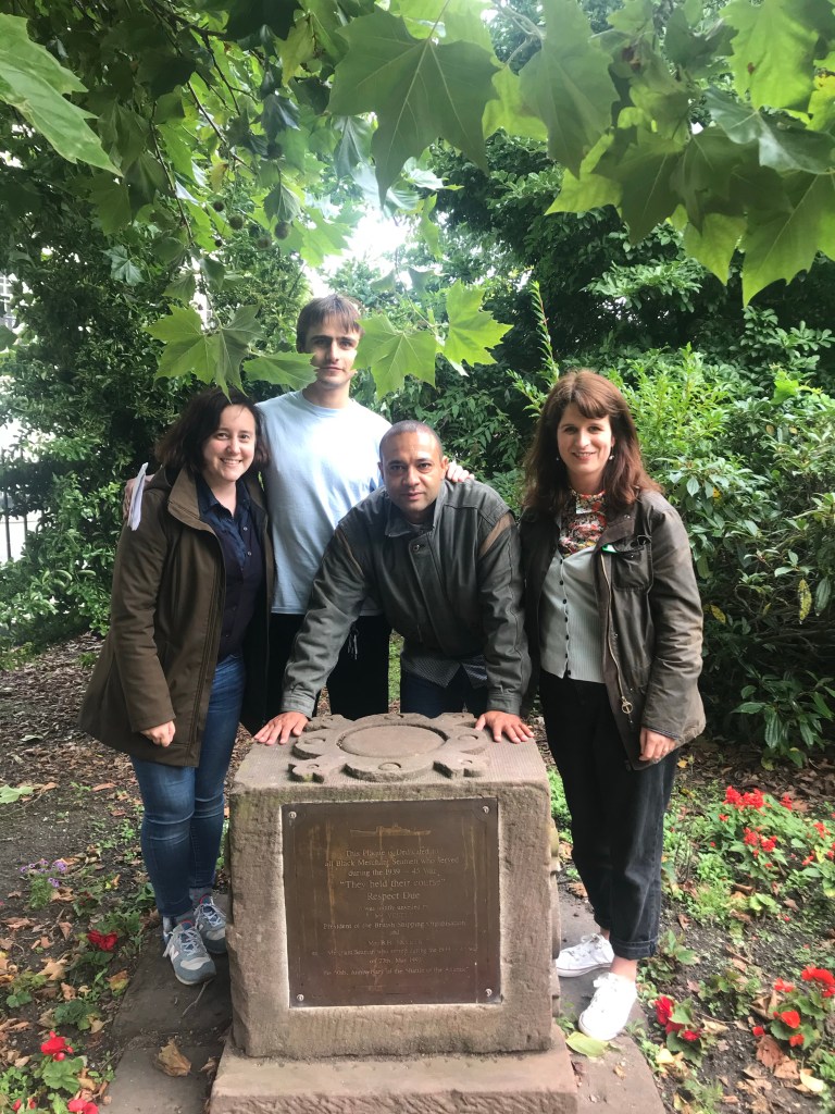 The importance of the Second World War in his own family’s history brings us back to Falkner Square Gardens. In the early 1990s, Joe was running a gallery on the square. At the events he organised there he hosted an array of brilliant and distinguished guests, including Maya Angelou and June Jordan. Around Christmas 1992 he was reading about the forthcoming fiftieth anniversary of the Battle of the Atlantic, and he resolved to establish a memorial in Liverpool, for all the Black merchant seamen who served during World War 2. He contacted the office of Edmund Vestey, who had been appointed as a Queen’s representative on memorials, who endorsed the idea and came to help unveil the memorial in November 1993. And he went down to Canning Place, by the docks, to the site of the Sailors’ Home where his grandfather had stayed. The home itself had been demolished, but the stones from the impressive archway which fronted it were piled up on the site, and Joe selected one of these for the memorial. He thought carefully about the location, but settled on Falkner Square Gardens because it had been home to the consulates of many different countries – including many African countries – so any seamen visiting Liverpool who needed to have any formal contact with their country’s consulate would have come to the square. It was another stop on one of their many long journeys, and a place that offered an official connection with their homes, just as the shops on Granby Street maintained cultural connections, and represented the way in which Liverpool itself became home to people of many different nationalities and ethnicities.
